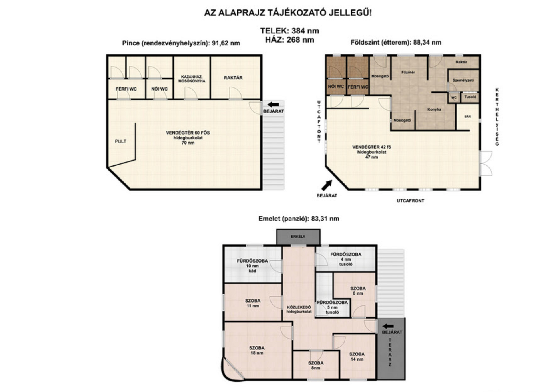 Az emeleten egy panzió üzemelt 5 darab különálló szobával, két 3 ágyas és három 2 ágyas szoba. Valamint három darab különálló fürdőszoba és egy mini teakonyha található. A szobák klimatizáltak és ablakai redőnyözöttek.