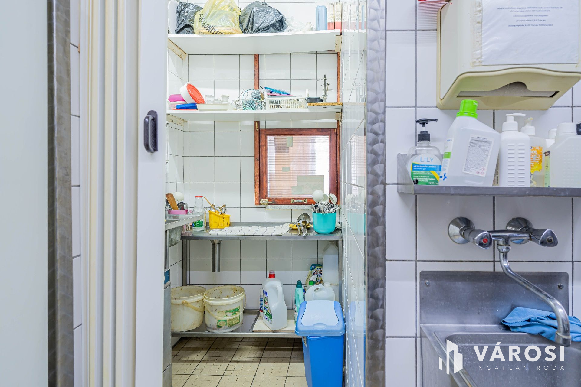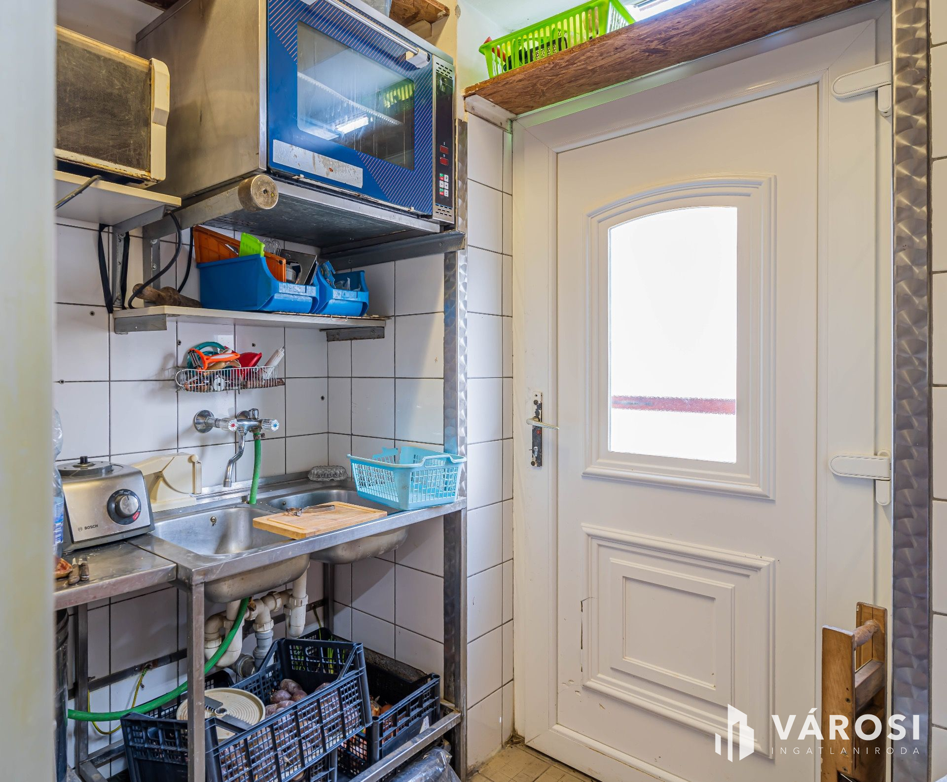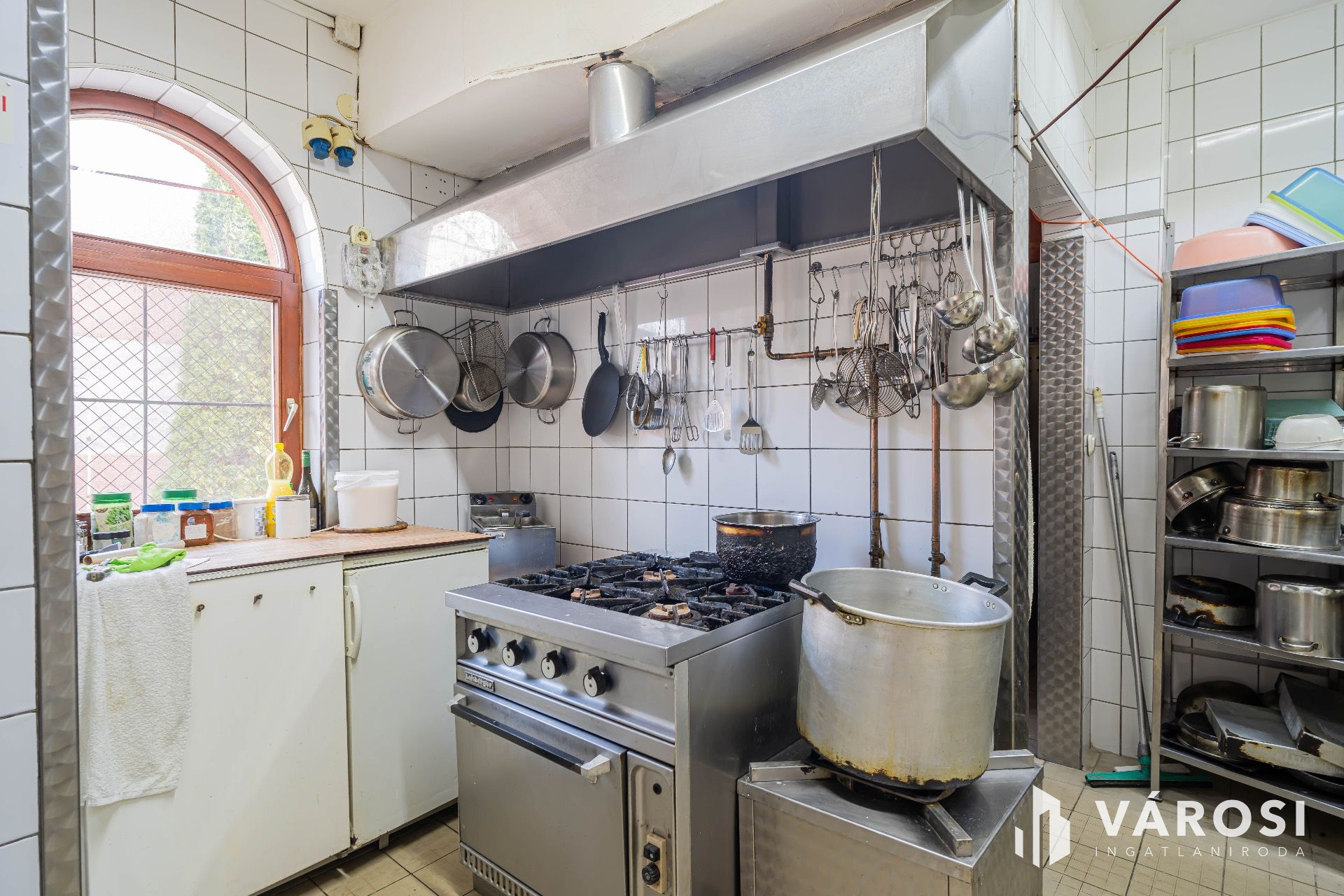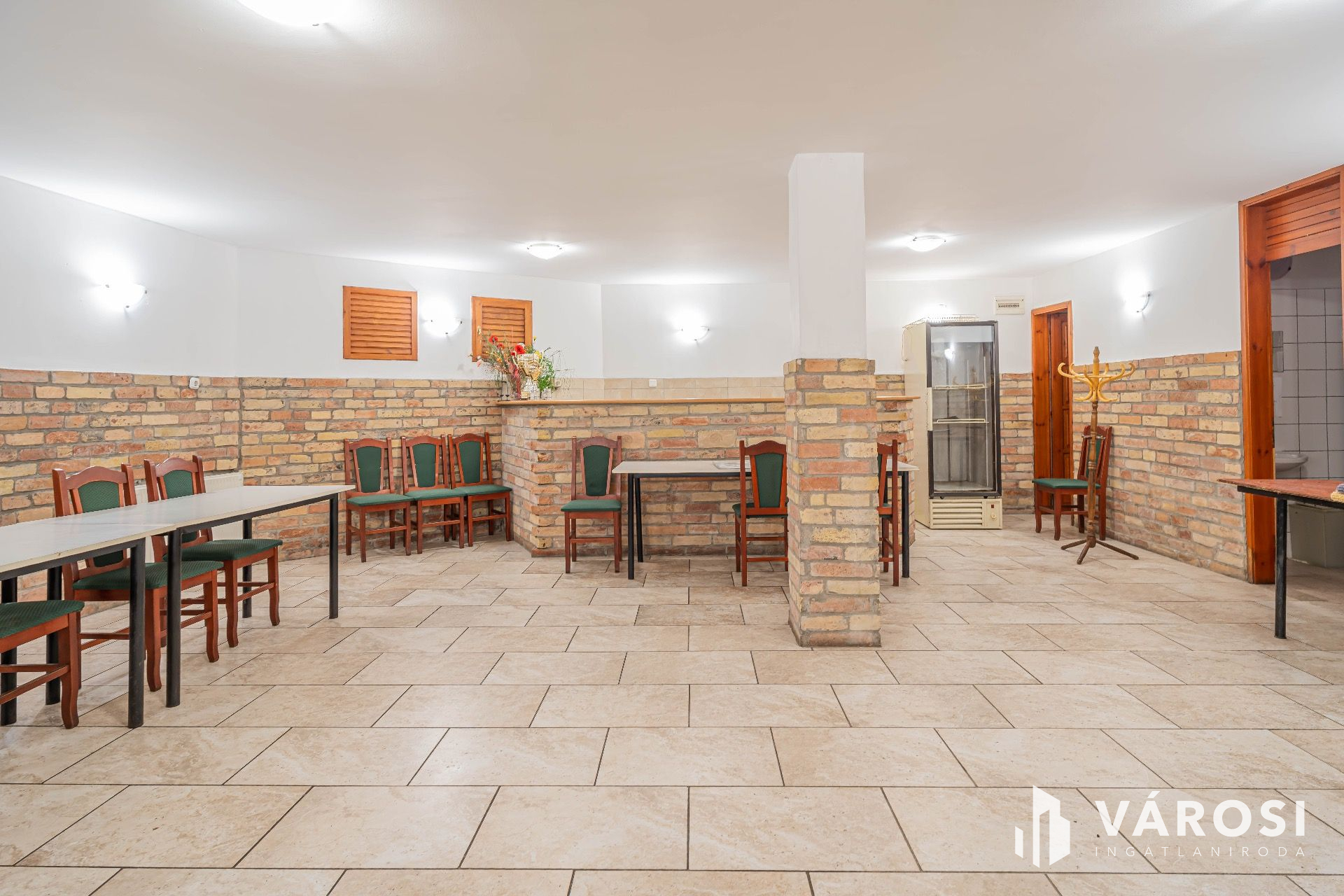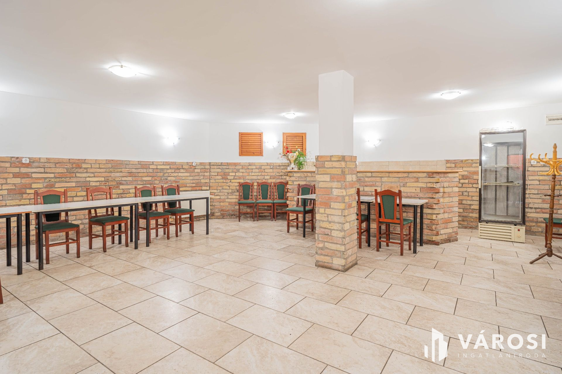 A földszinten egy utcai bejáratos meleg és hidegkonyhás étterem található, amely 42 fő kényelmes befogadására alkalmas, akár kisebb rendezvények lebonyolítására is kiváló helyszínt ad. A szinten található még egy bárrész és a mosdók. A konyhai rész praktikus elosztású. Az étteremből a zárt udvarra jutunk ki, ahol nyaranta kerthelyiség üzemelt.